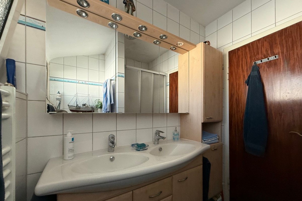 Die Wohnfläche verteilt sich auf einen geräumigen Wohn-Essbereich mit Zugang auf den sonnigen Balkon mit einem schönen Blick, eine kleine Arbeitsküche, im EG ein Tageslicht-Duschbad, ein Schlafzimmer sowie im hinten Hausbereich nochmals einen Wohnbereich mit Zugang auf die sonnige Terrasse und zum Schwimmbad. Das Obergeschoss präsentiert sich mit dem gleichen Schnitt, außer das im hinteren Hausbereich das große Zimmer mit Fertigbauwänden nochmals unterteilt wurde, so dass hier 2 Zimmer entstanden sind. Ein Rückbau wäre aber ohne großen Aufwand durchzuführen.