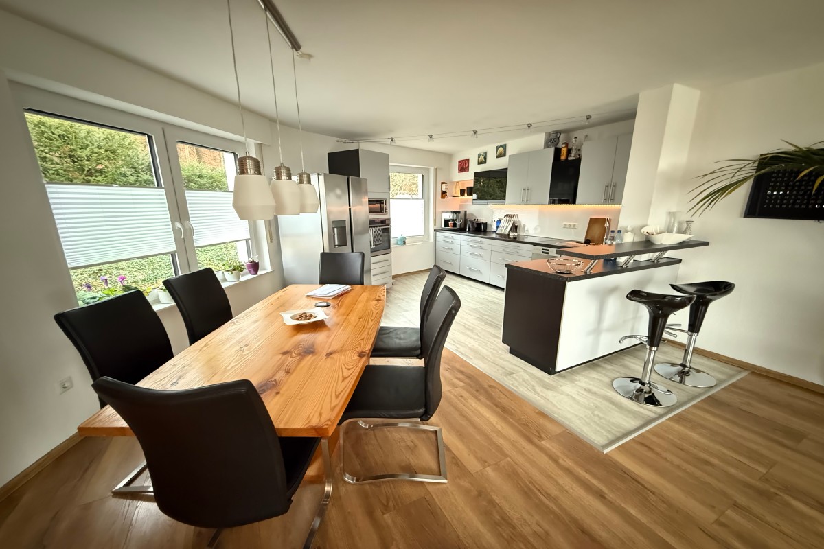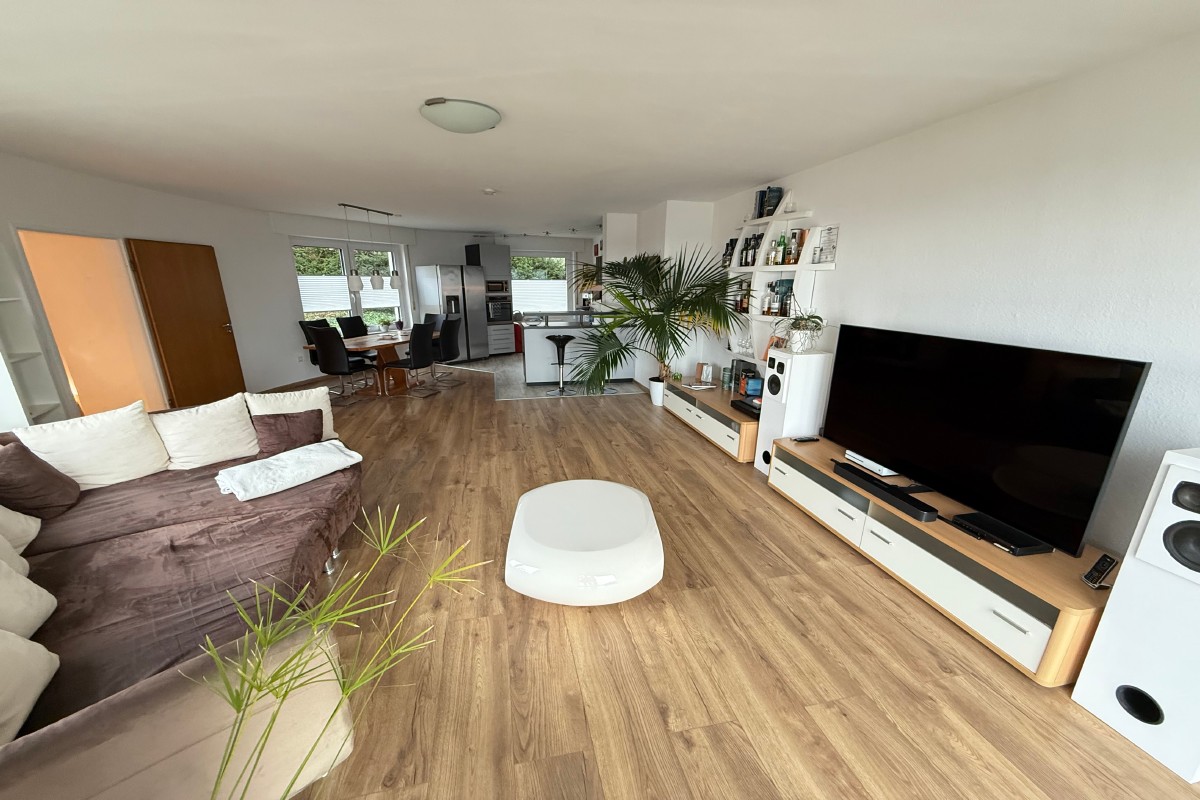 Auf der Wohnebene begeistert der große Wohnbereich mit großen Fensterflächen, der offenen modern gestalteten Küche und dem zweiten Balkon. Im Sommer und im Winter, der gemütliche Kaminofen sorgt für wohlige Temperaturen läßt sich von hier der wunderbare Blick über die Taunusebene geniessen.