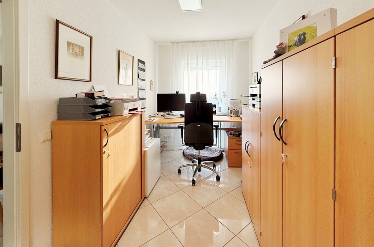 Die rund 93 m² Wohnfläche verteilen sich auf einen einladenden Flur, einen großzügigen Wohn- und Essbereich mit direktem Zugang zum Hauptbalkon, ein Gäste- oder Arbeitszimmer, ein komfortables Schlafzimmer sowie ein großzügiges Tageslichtbad mit Badewanne und separater Dusche. Ergänzt wird das Raumangebot durch ein separates Gäste-WC.