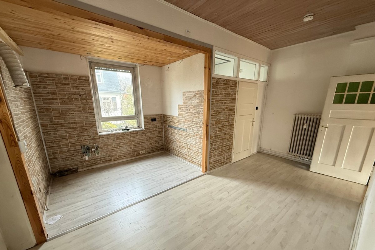 Schreiten Sie die schöne, originale Holztreppe hinauf ins Obergeschoss, wo der Ruhebereich entstehen kann, aktuell aber ein ähnlicher Grundriß auf sie wartet wie im Erdgeschoss mit einem zusätzlichen Tageslichtbad und einer großen Wohnküche. Hier können Sie z.b. ein wunderbares Bad entstehen lassen.