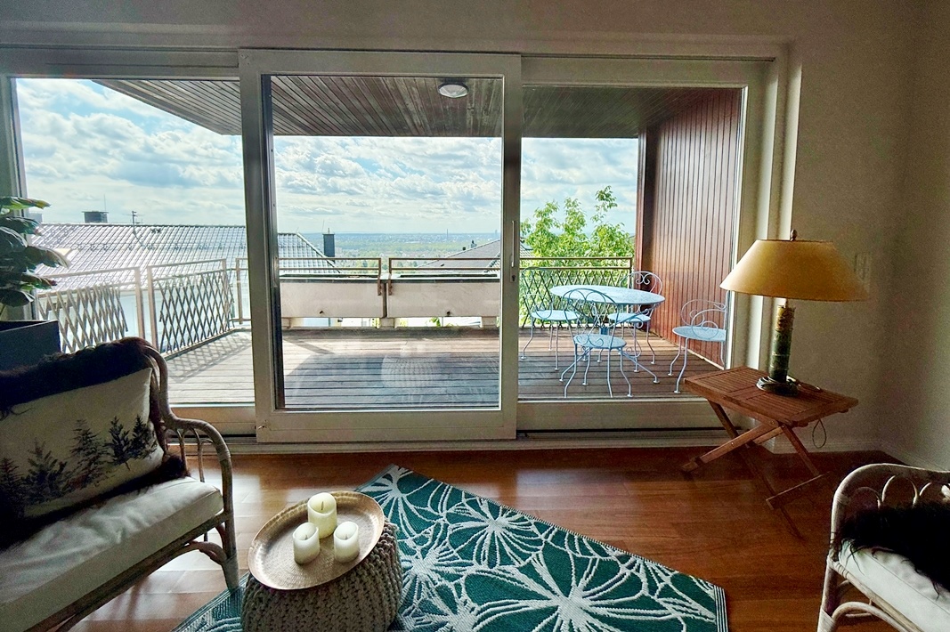 Das Herzstück der Wohnung ist der helle, repräsentative Wohnbereich mit breiter Fensterfront und Zugang zum sonnigen Balkon – genießen Sie hier einen einzigartigen Panoramablick über die gesamte Region. Für gemütliche Abende sorgt der offene Kamin mit Kassetteneinsatz. Die moderne, voll ausgestattete Küche mit integriertem Essplatz fügt sich harmonisch in das stimmige Gesamtbild ein.