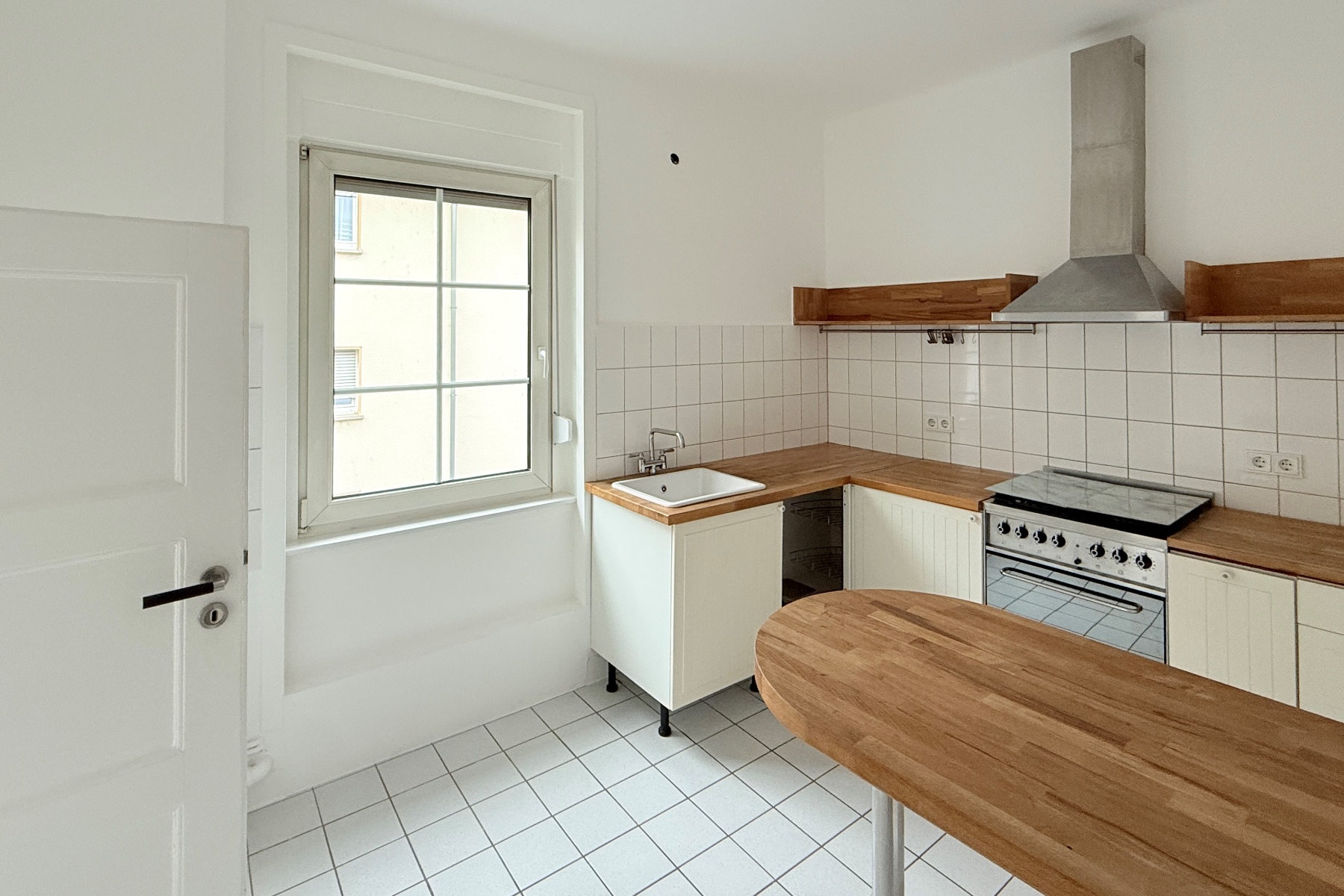 Echtholzböden in den Wohnräumen (überwiegend restaurierte Originalböden), Fliesen in Küche und Bad