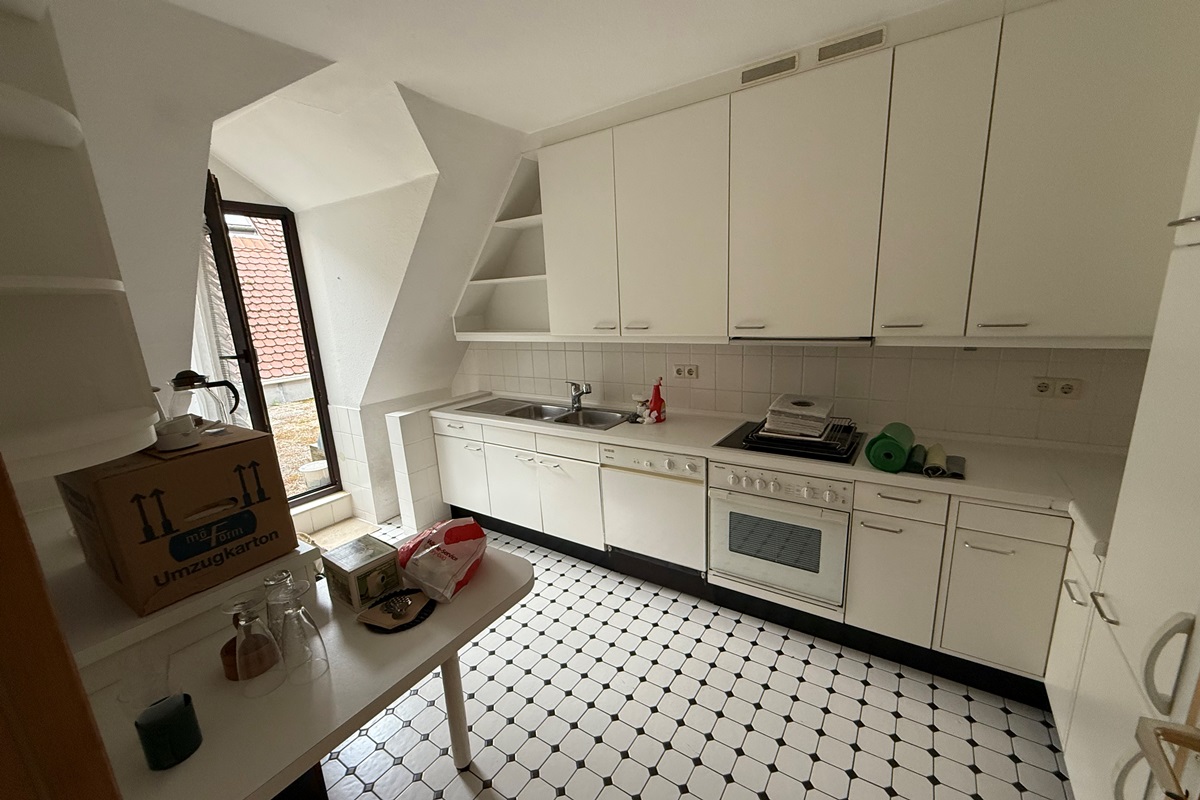 Die an den Wohnraum grenzende Küche bietet ebenfalls Zugang auf die Dachterrasse und ist praktisch als auch zeitlos gestaltet.