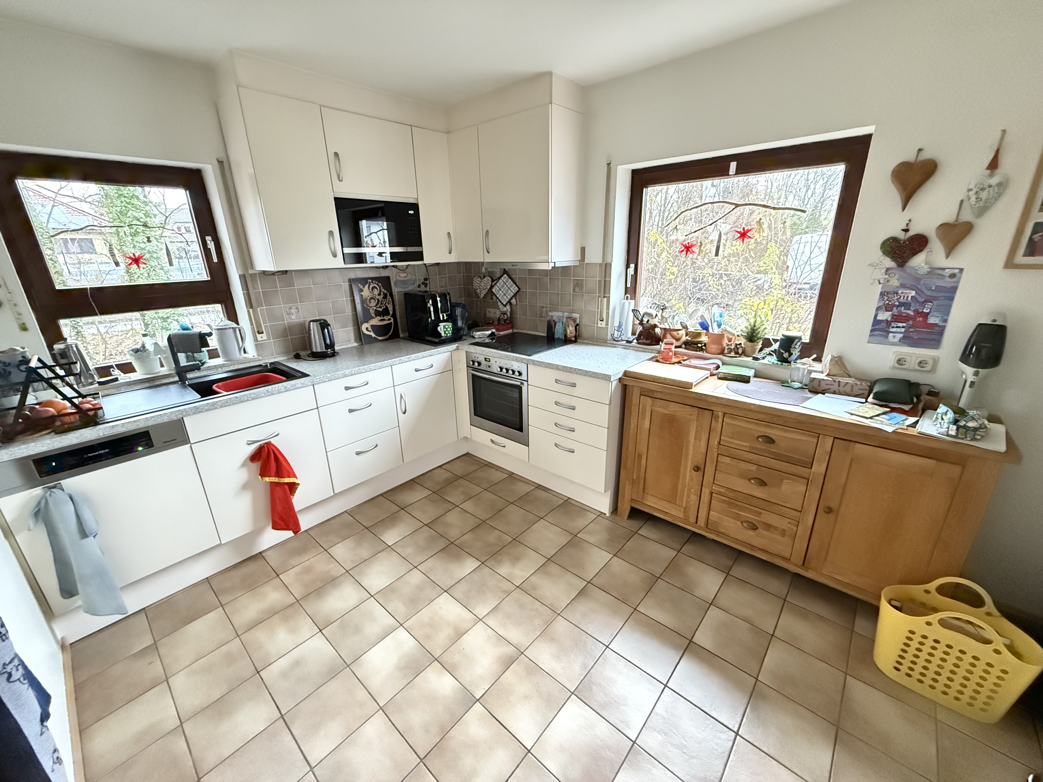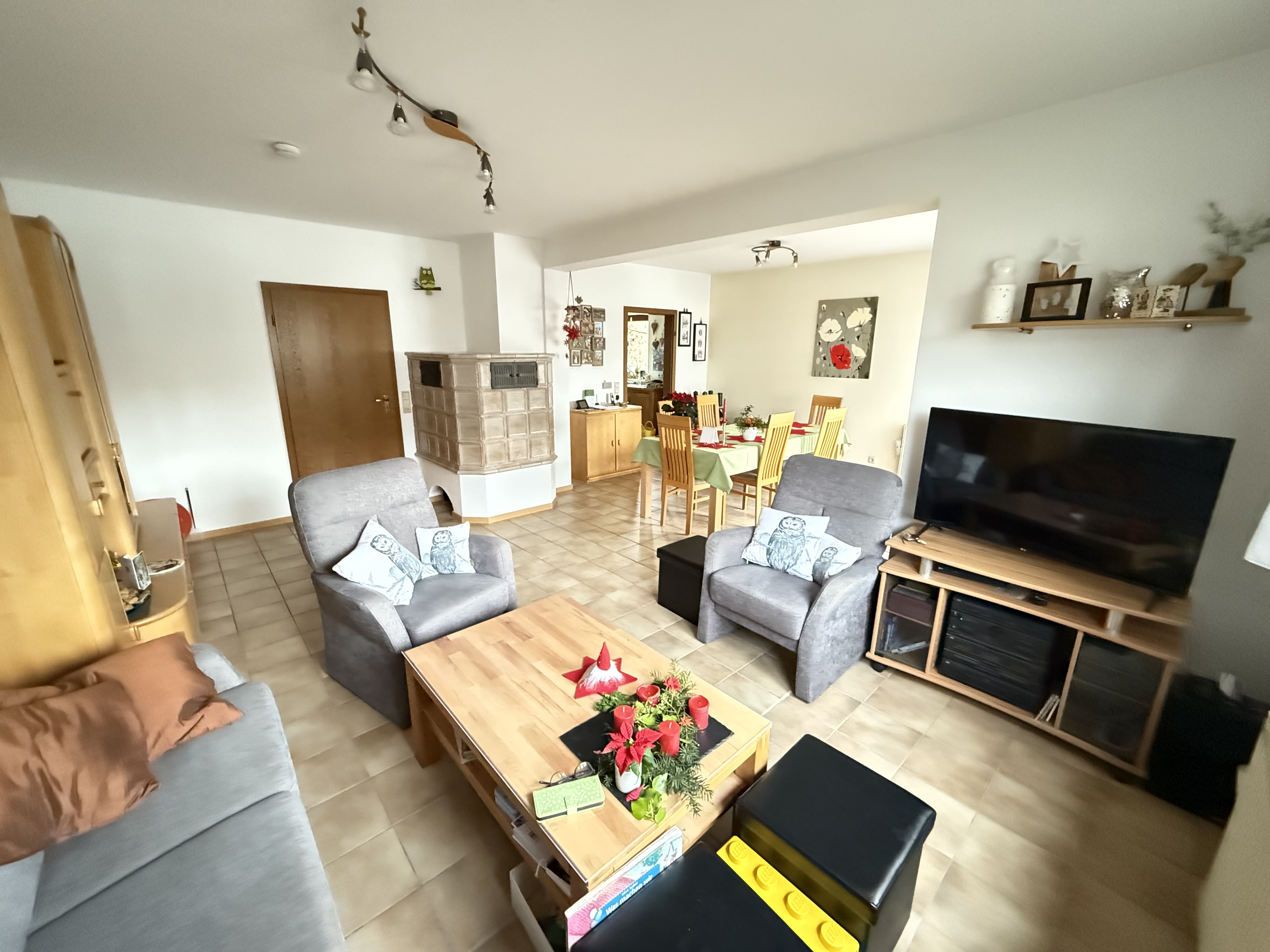 145m² Wohnfläche verteilen sich großzügig über 3 Etagen. Im Erdgeschoß betreten Sie das Haus über die wohnliche Diele mit Garderobe und Gäste-WC. Die Küche ist geräumig und modern ausgestattet und führt in das großzügige Wohn-Esszimmer mit dem gemütlichen Kachelofen und dem Zugang auf die sonnige Terrasse.