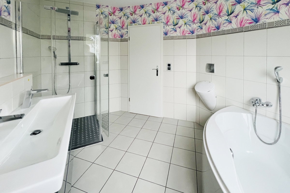 Im Erdgeschoss empfängt Sie ein heller Flur, der in den großzügigen Wohn- und Essbereich überleitet. Große Fensterflächen schaffen eine freundliche Wohnatmosphäre und ermöglichen den direkten Zugang zur Terrasse sowie in den ca. 200 m² großen Garten. Dieser ist als Sondernutzungsrecht eingetragen und stellt ein echtes Highlight für Naturliebhaber, Familien und Genießer dar. Die praktisch geschnittene Küche mit angrenzendem Abstellraum, zwei gut geschnittene Schlafzimmer sowie ein modernes Tageslichtbad mit Badewanne und bodentiefer Dusche ergänzt das Raumangebot auf dieser Ebene optimal.
