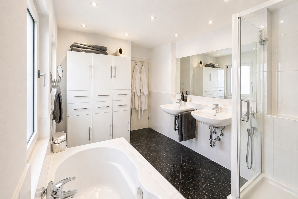 Das Obergeschoss bietet ein großzügiges Elternschlafzimmer mit knapp 30 m² Wohnfläche, praktischem Abstellraum sowie einem beeindruckenden, etwa fünf Meter langen Einbauschrank. Ein gemütliches Kinderzimmer mit Zugang zu einer weiteren Dachterrasse ergänzt das Raumangebot. Auf dieser Etage stehen zudem ein Gäste-WC sowie ein Tageslichtbad mit Badewanne, Dusche und Doppelwaschbecken zur Verfügung.